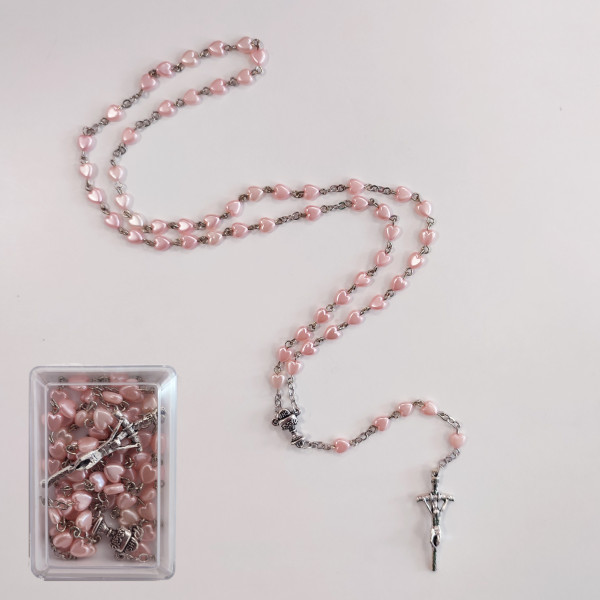 Růženec je zabalen v bílé krabičce s průhledným víkem ve tvaru srdce. Korálky růžence jsou ve tvaru srdce, v růžové barvě a spojeny jsou kovovými háčky.