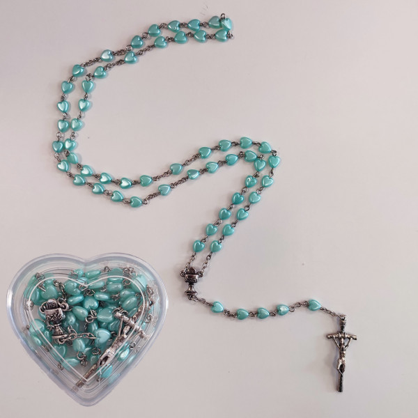 Růženec je zabalen v bílé krabičce s průhledným víkem ve tvaru srdce. Korálky růžence jsou ve tvaru srdce, v modré barvě a spojeny jsou kovovými háčky.