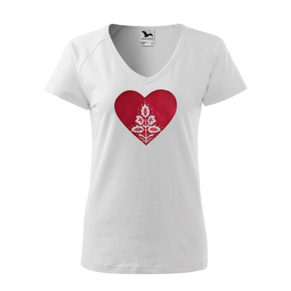 Kvalitní dámské tričko s krátkým rukávem raglánového střihu a výstřihem ve tvaru V. Stálost tvaru je zaručena přidáním elastanu. Tričko je vyrobeno z 95% bavlny a 5% elastanu. Je vhodné pro každou příležitost i na každodenní nošení. Na tričku se nachází nášivka s folklórním vzorem.
