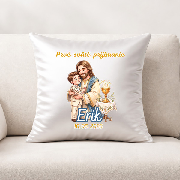 V ceně je zahrnut polštář 30x30cm a snímatelné saténové povlečení s potištěným obrázkem s tématikou prvního svatého přijímání.